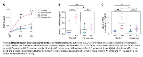 5 測量了運輸蛋白表達(如NHE3、NKCC2),KO小鼠NHE3表達降低,但功能實驗顯示NKCC2活性增加。研究意義是提示補償機制涉及遠端腎單位運輸上調。