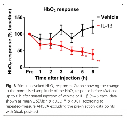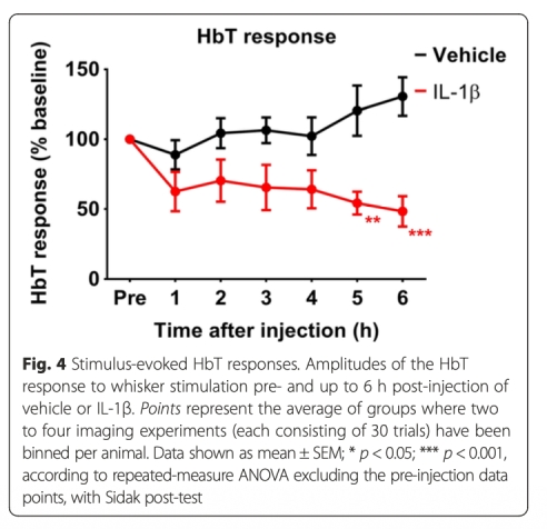1 測量了血流動力學(xué)反應(yīng),包括HbO2和HbT濃度變化,通過光學(xué)成像光譜。數(shù)據(jù)顯示IL-1β注射后HbO2和HbT反應(yīng)顯著降低,從5小時開始(數(shù)據(jù)來自圖3和圖4)。研究意義是直接證明IL-1β?lián)p害血流動力學(xué)反應(yīng),可能導(dǎo)致腦部氧供應(yīng)不足,在與IL-1β相關(guān)的神經(jīng)疾病中起關(guān)鍵作用。