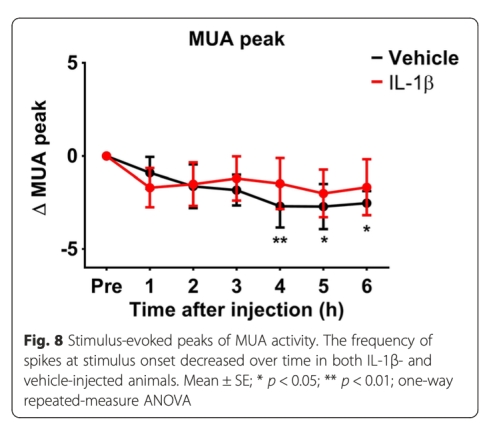 2 測量了神經(jīng)元活動,包括LFP的伽馬波段(40-100 Hz)和貝塔波段(13-24 Hz)活動,以及MUA。數(shù)據(jù)顯示IL-1β注射后伽馬和貝塔波段活動顯著降低,從1-3小時開始,而MUA無顯著變化(數(shù)據(jù)來自圖6和圖8)。研究意義是表明IL-1β影響神經(jīng)元輸入(LFP),但未直接損傷神經(jīng)元輸出(MUA),突顯神經(jīng)血管耦合特異性破壞。