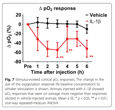 3 測量了組織氧分壓(pO2),使用丹麥Unisense電極。數(shù)據(jù)顯示IL-1β注射后pO2反應(yīng)從3小時開始降低(數(shù)據(jù)來自圖7)。研究意義是提供直接氧合證據(jù),證實IL-1β導(dǎo)致組織缺氧,支持血流動力學(xué)反應(yīng)受損的結(jié)論。