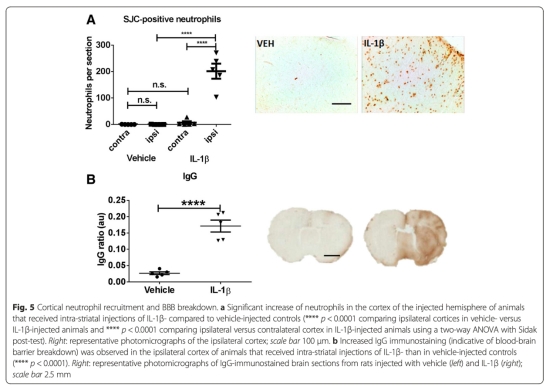 4 測量了炎癥標(biāo)記,包括中性粒細(xì)胞(SJC陽性)和免疫球蛋白G(IgG)滲出,通過免疫組化。數(shù)據(jù)顯示IL-1β組炎癥標(biāo)記增加(數(shù)據(jù)來自圖5)。研究意義是確認(rèn)IL-1β誘導(dǎo)神經(jīng)炎癥,可能通過血腦屏障破壞加劇耦合損傷。