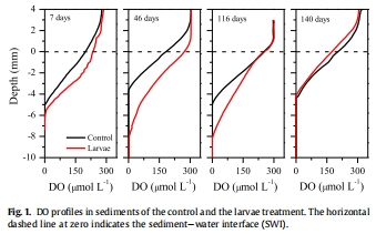 提供關(guān)鍵的機(jī)制啟動(dòng)證據(jù):Unisense微電極提供的毫米級高分辨率DO剖面(圖1)是證明生物擾動(dòng)發(fā)生及其強(qiáng)度的最直接證據(jù)。數(shù)據(jù)顯示,在有幼蟲處理的沉積物中,氧的滲透深度在第7、46、116天均顯著大于對照組。例如,在第46天,處理組的氧滲透深度為8.1毫米,而對照組僅為3.6毫米。這直觀地證實(shí)了幼蟲的生物灌溉行為將上覆富氧水泵入其洞穴,從而在沉積物中創(chuàng)造了局部的氧化微環(huán)境。