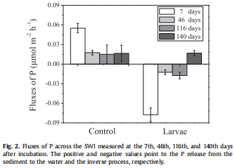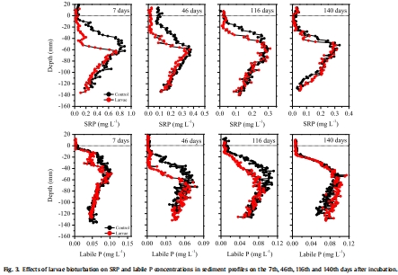顯著抑制效應(yīng):搖蚊幼蟲的生物擾動(dòng)能顯著降低沉積物表層(最深至70-90毫米)孔隙水中可溶性和活性磷的濃度,最大降幅可達(dá)對照組的一半以上,并將沉積物從磷的“源”轉(zhuǎn)變?yōu)椤皡R”。