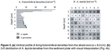 活體有孔蟲(Ammonia tepida)的密度分布: