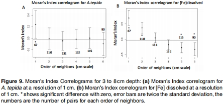 數據內容:對3-8厘米深度的 A. tepida密度計算莫蘭指數,顯示其在厘米尺度上呈斑塊分布(一階鄰居I=0.24)。而溶解鐵在同一尺度下的斑塊性更強(I=0.7),特征長度更大(3-4厘米)。