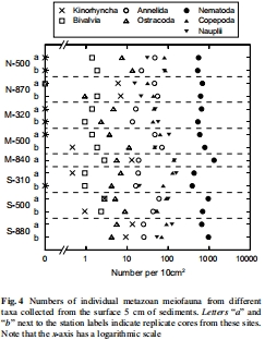 數據內容:線蟲和橈足類是優勢類群。在M線和S線的多個站點,線蟲的豐度峰值出現在1-2厘米深度,而非典型的沉積物最表層。相反,橈足類的密度峰值始終出現在最表層0-1厘米。