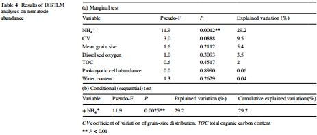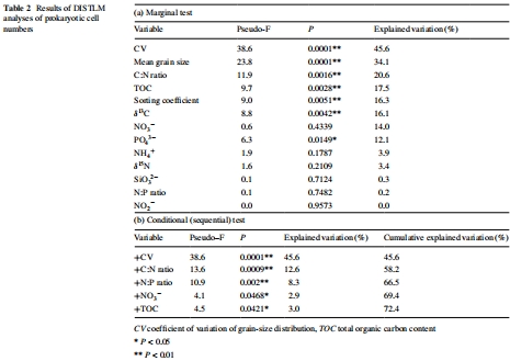 研究意義:DISTLM分析顯示,原核細胞豐度的變化主要與粒度分布變異系數、平均粒徑等因素顯著相關;橈足類密度與溶解氧和銨鹽濃度顯著相關;線蟲密度僅與銨鹽濃度顯著相關。這揭示了控制生物分布的關鍵環境驅動因子。