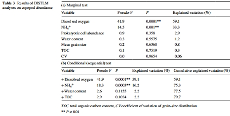 直接關聯生物分布與環境條件:獲取的溶解氧剖面數據作為關鍵環境變量被納入DISTLM統計分析。分析結果明確顯示,溶解氧濃度是解釋橈足類密度變化的最重要因子,單獨解釋了59.1%的變異。這直接證明了橈足類的分布嚴格受沉積物中有氧區域的限制,它們無法利用缺氧的亞表層中可能存在的有機質。