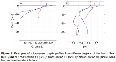 數據內容:Unisense微電極測量顯示,在滲透性沉積物站點,氧氣在表層20毫米內未耗盡;而在某些細顆粒站點,氧氣在幾毫米深處即耗盡。pH剖面通常顯示在亞表層出現最小值,與氧氣耗盡深度吻合。