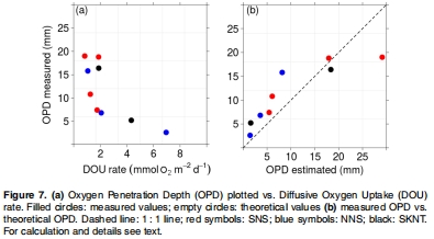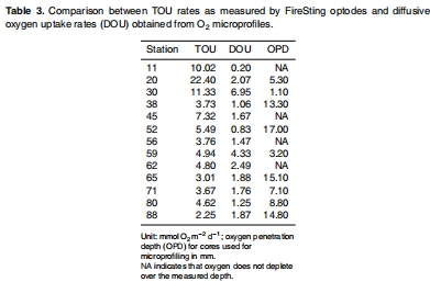 區分擴散與平流傳輸的貢獻:通過對比由微剖面計算的擴散性氧氣吸收速率和由培養箱測量的總耗氧量(表3),發現總耗氧量遠大于擴散性氧氣吸收速率(比值最高達50.1)。這一巨大差異強有力地證明了在北海(尤其是南部北海的滲透性沉積物中),物理(底流驅動)和生物(生物灌溉)過程導致的平流/灌流傳輸是氧氣和溶質交換的主導機制,而非單純的分子擴散。