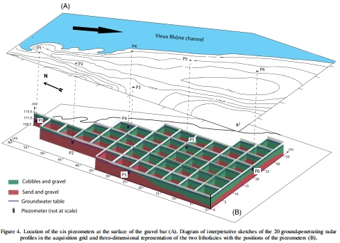 這篇論文探討了探地雷達(GPR)作為一種非侵入性工具,用于探測礫石河床河流沉積物結構及其與地下生物活性區之間聯系的可行性。摘要指出,在地貌單元(如礫石壩)尺度上,河岸帶對河流功能的貢獻取決于地表水與地下水之間的水文交換,這些交換主要受沉積物結構和紋理控制,但傳統方法難以評估。研究通過GPR數據采集和處理,對礫石壩進行三維重建,識別出兩種沉積相:卵石/礫石巖相(“粗顆粒”結構)和沙/礫石巖相(“細顆粒”結構)。沿兩條分別對應不同巖相的縱向剖面安裝測壓計并監測水頭和溫度20天,同時采集水和沉積物樣品,測量水體理化性質、沉積物特性、細菌豐度和活性以及間隙無脊椎動物群落。結果表明,兩條剖面具有不同的水文流速和相關的生物活性。粗顆粒剖面中快速的水流輸送為河岸帶提供了有機質,而細顆粒剖面中的水和有機質供應較低。因此,粗顆粒剖面中較高的有機質供應與較高的微生物活性和無脊椎動物密度及多樣性相關。證明GPR是探測沉積物特征的有效工具,這些特征在河岸帶功能中起關鍵作用。