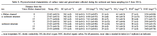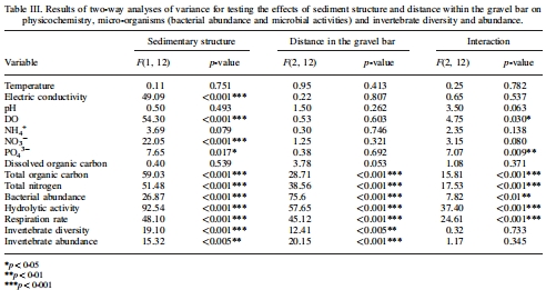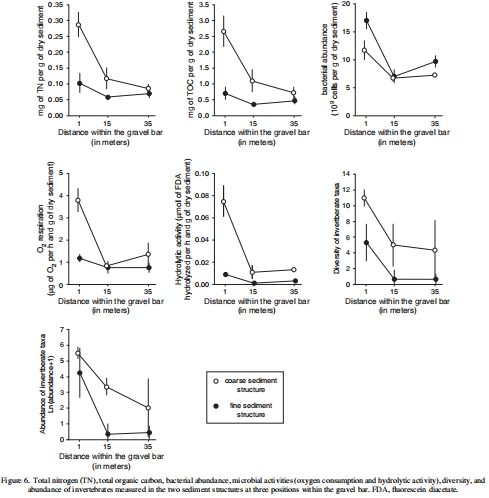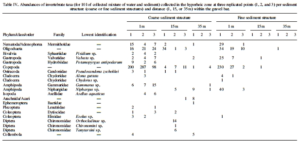 數據內容:無脊椎動物的多樣性和豐度在粗顆粒結構中顯著高于細顆粒結構,并隨距離河道增加而減少。常見地表棲息種類(如Gammarus, Asellus aquaticus)僅在粗顆粒結構中出現。