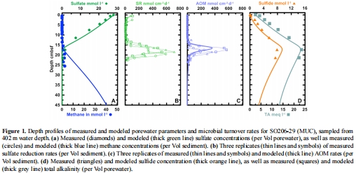 AOM和硫酸鹽還原速率:通過放射性示蹤技術(1?CH?和3?SO?2?)測量。SO206-31站位的AOM峰值達1400 nmol cm?3 d?1(圖2c),表明該區域甲烷循環極為活躍。