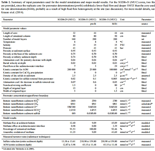 數值模擬:建立一維傳輸反應模型,模擬孔隙水剖面,估算流體流速和AOM速率。