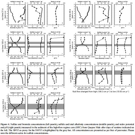 指示微生物活動:硫化物濃度變化直接反映AOM和硫酸鹽還原的強度。峰值出現于SMTZ內(如LFC中4.5-5.5 cmbsf處,圖3q),證實了該區域為微生物活躍帶。