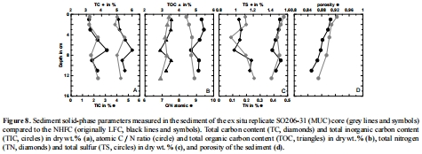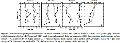 總有機碳(TOC)、總無機碳(TIC)和C/N比值(圖8、圖9)用于評估有機質降解對硫酸鹽還原的貢獻。高C/N比值(8.67-9.43)表明沉積物經歷顯著微生物降解。