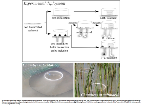 摘要指出,有機質的再礦化在控制海洋沉積物的生物地球化學過程中起著關鍵作用。通過其掘穴活動,生物擾動的大型動物不僅會引起物理、化學和生物變化,影響負責有機質再礦化的微生物群落,還可能直接影響沉積有機質的分布和生物可利用性。本研究通過在現場操縱螃蟹和洞穴密度進行實驗,評估了螃蟹的生物擾動是否影響底棲代謝、沉積有機質的數量、分布和生物可利用性。研究發現,螃蟹的生物擾動增強了潮灘和鹽沼區域的整體底棲代謝以及溶解性有機質向水體的底棲通量。此外,生物擾動還改變了潮灘和鹽沼中沉積有機質的質量、生物可利用性和分布。總體而言,生物擾動提高了被擾動沉積物中易分解有機碳的比例,并在易分解有機碳比例方面均質化了沉積柱。然而,螃蟹也產生了生物結構(如土堆),可能促進高營養價值有機質的空間異質性。生物擾動引起的底棲代謝和有機質可利用性的變化,將導致本研究區域潮間帶系統碳儲存能力的降低。
