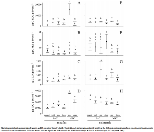沉積物有機質組成數據:測量了沉積物中的碳水化合物碳、蛋白質碳、脂質碳和總有機碳含量。例如,在光灘,非生物擾動的表層沉積物碳水化合物和總有機碳含量最高,而螃蟹土堆中蛋白質含量最高。