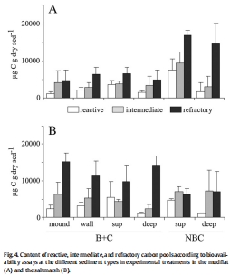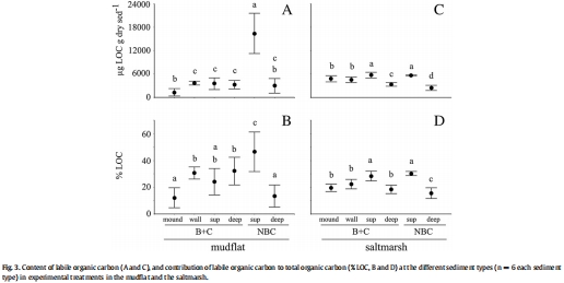 研究意義:LOC是能被底棲消費者利用的有機碳部分。研究發現生物擾動提高了沉積物柱中LOC的比例并使其分布更均勻。這表明螃蟹活動使沉積物中的有機質總體上變得更“新鮮”和更易被利用。