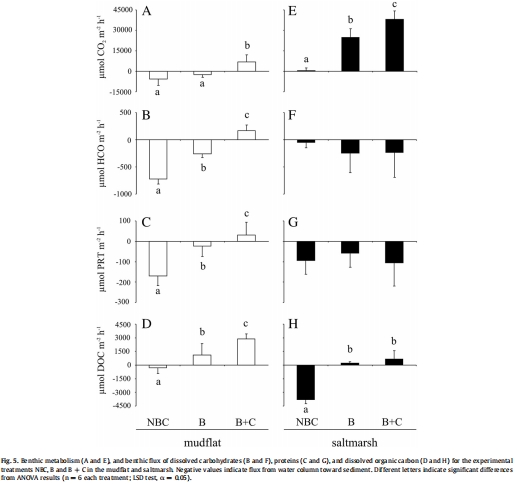 底棲通量數據:使用底棲培養艙測量了CO?、溶解有機碳、碳水化合物和蛋白質通過水-沉積物界面的通量。關鍵發現是,在有螃蟹生物擾動(B+C)的處理中,沉積物向水體釋放CO?和DOC;而在無生物擾動的對照(NBC)中,則是從水體吸收DOC。