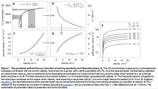 理論建模:基于傳感器攪拌敏感性的物理機制(流速影響傳感器尖端擴散邊界層厚度,從而影響信號),建立數學模型(MODEL 1 和簡化的 MODEL 2),預測人工通量如何隨平均流速、雷諾應力、傳感器靈敏度等參數變化。理論預測展示在圖1中。