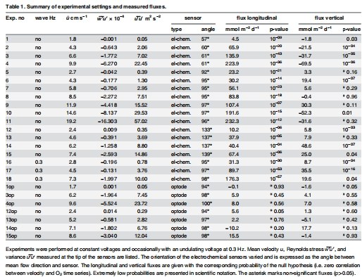 人工氧氣通量數據:在無真實通量的水槽中,計算出的電化學傳感器信號與流速波動之間的通量即為人工通量。結果顯示,縱向和垂直方向均檢測到顯著的人工通量,其值范圍很廣(見表1),且隨流速增加而增大。光學傳感器則未測到顯著通量。