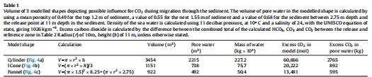 模型估算的二氧化碳溶解量數據:研究人員構建了三種可能的二氧化碳在沉積物中遷移的幾何模型(圓柱體、圓錐體、漏斗形),結合測量的孔隙度、DIC差異等參數,估算了滯留于沉積物孔隙水中的二氧化碳質量。