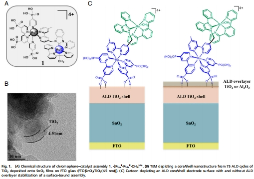 采用原子層沉積技術(shù)沉積薄的氧化物(Al?O?或TiO?)覆蓋層,以穩(wěn)定發(fā)色團-催化劑組裝體在氧化物表面的結(jié)合,尤其是在近中性pH的緩沖液中,解決其易水解脫落的問題。