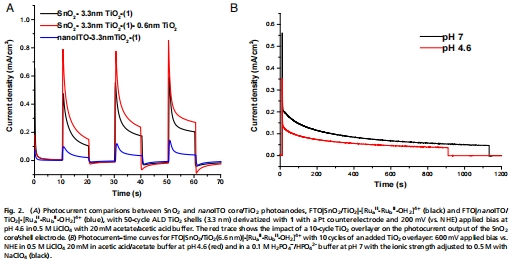 利用SnO?/TiO?核/殼結(jié)構(gòu)替代先前使用的nanoITO/TiO?結(jié)構(gòu),以利用其更有利的能帶結(jié)構(gòu)來抑制背電子轉(zhuǎn)移,從而提高光電流效率。