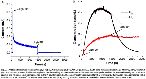 在染料敏化的光電合成電池中,可見的光化學(xué)水分裂成H2和O2