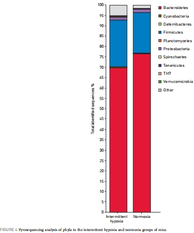 本研究評(píng)估了模擬阻塞性睡眠呼吸暫停(OSA)核心特征之一的間歇性低氧是否會(huì)改變小鼠模型的糞便微生物組。通過(guò)測(cè)量結(jié)腸糞便中的氧分壓(PaO2)并分析微生物組組成,研究發(fā)現(xiàn)間歇性低氧在腸道近上皮區(qū)域(<200μm)引發(fā)了低氧/再氧合事件,導(dǎo)致微生物組全局結(jié)構(gòu)改變,包括α-多樣性(Shannon指數(shù))增加和β-多樣性變化。具體而言,間歇性低氧暴露組小鼠的厚壁菌門(Firmicutes)豐度增加,而擬桿菌門(Bacteroidetes)和變形菌門(Proteobacteria)豐度減少。這表明間歇性低氧可能通過(guò)改變腸道微生物組,影響OSA相關(guān)的生理互作。