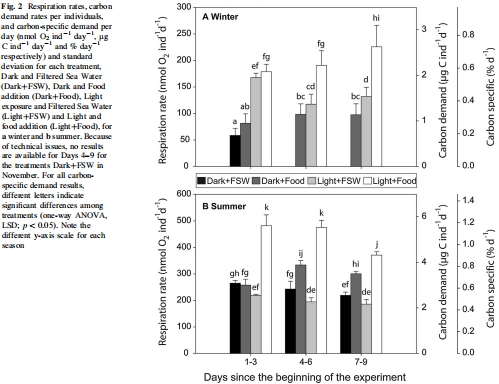 揭示生理響應的動態過程:該測量方法使得研究者能夠追蹤9天實驗期內新陳代謝的動態變化。例如,數據顯示在冬季,光照處理組若沒有食物,代謝率在初期升高后又會下降。這揭示了橈足類的響應不是一個簡單的開關效應,而是一個依賴持續能量供應的動態調整過程。