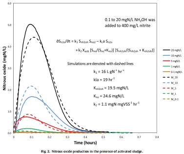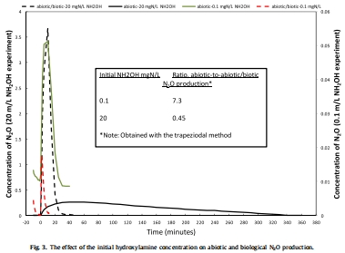 數據內容:在存在活性污泥的條件下,添加羥胺后測得的溶解N?O濃度遠高于純非生物實驗。