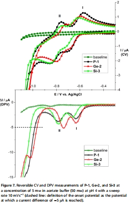 數據內容:CV和DPV曲線顯示所有POMs在-0.64 V至-0.81 V(vs. Ag/AgCl)范圍內有兩個可逆的還原波(歸屬為W??/W??)。Ge-2的第二個還原波電位(-0.763 V)比P-1和Si-3的更正。電催化析氫的起始電位也遵循Ge-2 > P-1 > Si-3的順序。