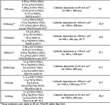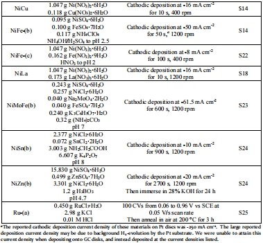 催化劑庫的構(gòu)建:通過電沉積法在玻碳電極上制備了多達(dá)數(shù)十種不同的HER和OER催化劑,并詳細(xì)記錄了每種催化劑的沉積溶液配方和沉積條件(表S1, S2)。