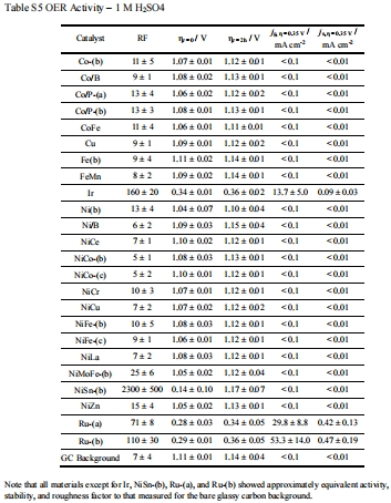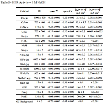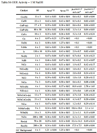 研究意義:這是量化催化劑本征活性的核心指標(biāo),允許在不同催化劑間進(jìn)行公平比較,識別出高性能催化劑(如NiMo對于HER,Ir/Ru對于OER)。數(shù)據(jù)來自表S3(HER in acid)和表S5(OER in acid)以及表S4(HER in base)和表S6(OER in base)。