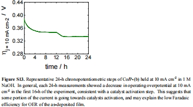數(shù)據(jù)內(nèi)容:記錄催化劑在恒電流(如10 mA cm?2)下持續(xù)電解2小時(shí)或24小時(shí)后的過電位變化。例如,圖S13顯示了Co/P-(b)在24小時(shí)OER測試中過電位先略有下降(活化)后穩(wěn)定的現(xiàn)象。