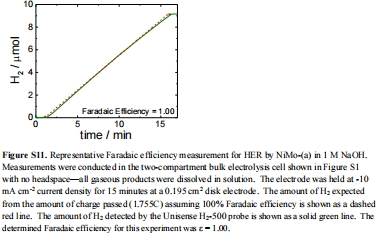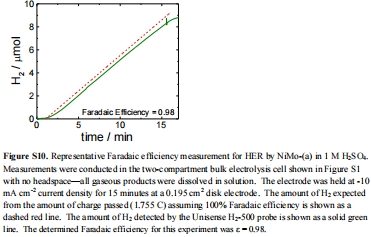 數(shù)據(jù)內(nèi)容:使用Unisense H?-500或Ox-500探頭在密閉電解池中實(shí)時(shí)監(jiān)測產(chǎn)生的氫氣或氧氣量,與理論計(jì)算值對比得出法拉第效率。例如,圖S10顯示NiMo-(a)在酸性HER中的法拉第效率為98%。