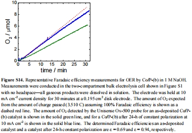 研究意義:直接驗(yàn)證電流是否有效用于目標(biāo)產(chǎn)物(H?或O?)的生成,而非副反應(yīng),是評價(jià)催化劑選擇性的關(guān)鍵。數(shù)據(jù)來自圖S10-S12, S14。