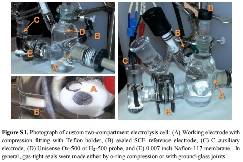 材料與裝置標(biāo)準(zhǔn)化:首先明確所有化學(xué)試劑的規(guī)格和來源,并詳細(xì)介紹了定制雙室電解池的設(shè)計(jì)(圖S1),該池體集成了工作電極、參比電極、輔助電極以及關(guān)鍵的丹麥Unisense氧(Ox-500)或氫(H2-500)微傳感器探針,并使用Nafion-117膜隔離兩室,確保氣體測量的準(zhǔn)確性。