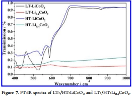 FT-IR光譜:脫鋰后Co-O和Li-O振動(dòng)模式消失,低波數(shù)區(qū)透射率降低,提示金屬性增強(qiáng)。研究意義:支持空穴離域和導(dǎo)電性提升。數(shù)據(jù)來自圖7。