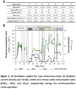 數據內容:包括硝酸鹽消耗速率(ΔNO?)、亞硝酸鹽消耗速率(ΔNO?)、氧化亞氮消耗速率(ΔN?O)、絕對電流密度(|j|)和庫侖效率(CE)。例如,ΔNO?在壓力測試下變化范圍大(15–157 mgN·L?1NCC·d?1),電流密度在0–25 mA·L?1NCC之間。