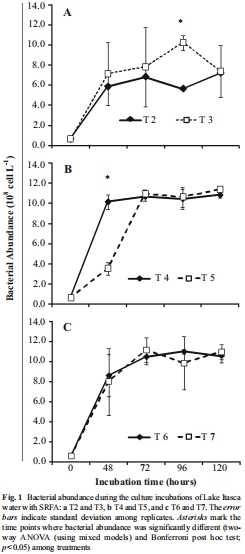 實驗一(氨基酸添加實驗):在Lake Itasca水樣中添加不同組合的氨基酸(18種全氨基酸、14種非光敏氨基酸、4種光敏氨基酸),并暴露于太陽能模擬器(光處理)或黑暗處理,培養120小時。監測細菌豐度、細菌生產(BP)、細菌呼吸(BR)、溶解氧(DO)等指標。