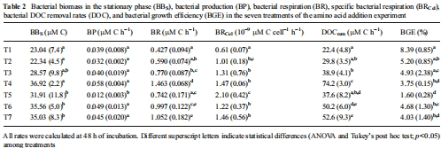 研究意義:直接證明光降解降低細菌能量利用效率,因細菌需分配更多能量至合成修復而非生長。數據總結自表2(各處理BP、BR、BGE值)。