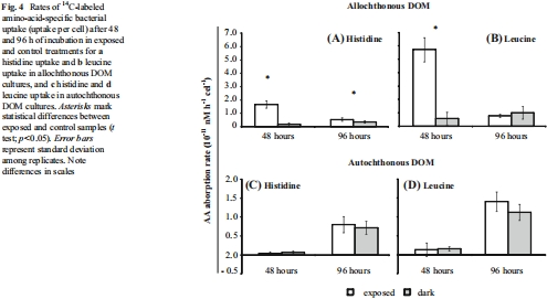 數據內容:使用14C標記組氨酸(光敏)和亮氨酸(非光敏)測量攝取率。光暴露后,外來DOM中組氨酸攝取率顯著升高(48小時時光處理組比對照高約50%),自生DOM中無變化。