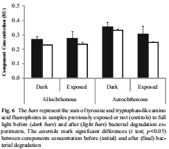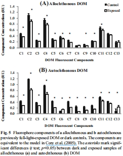 數據內容:光暴露后,酪氨酸和色氨酸樣熒光組分(C8、C13)濃度下降;細菌降解進一步減少這些組分。