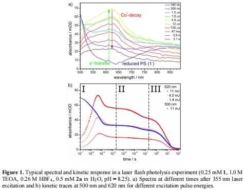 研究意義:直接揭示了電子從PS?到CoII的轉移過程(k?? = 1.7×10? M?1s?1),并表明CoI的衰變涉及復雜步驟(如質子化、二聚或側反應)。這些數據是推導反應序列的基礎。數據來自Figure 1a(光譜演化)和Figure 1b(動力學軌跡)。
