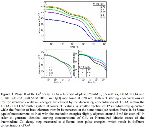 研究意義:表明CoI衰變受質子化控制,并提示可能涉及二聚平衡或與TEOA衍生物(如亞胺離子)的加合物形成。數據來自Figure 3a–c(pH和濃度依賴性)。