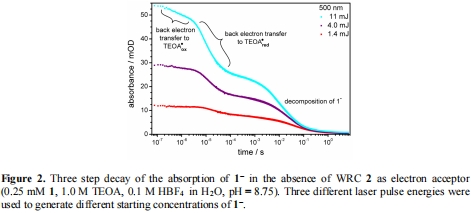 數據內容:無WRC時,1?的衰變顯示三步驟過程(數微秒、數十微秒、數毫秒),歸因于與TEOA自由基的回電子轉移。