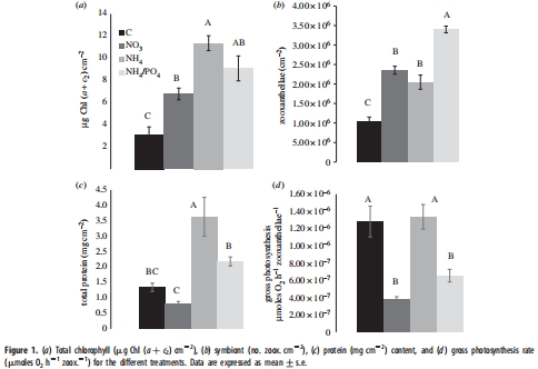 研究意義:這些數據直接反映了營養富集對共生體生物量和代謝活性的影響。NH4+提升光合效率,而NO3?抑制碳固定,表明氮源類型對共生體健康至關重要。數據來自Figure 1。